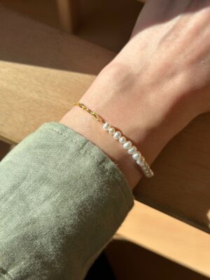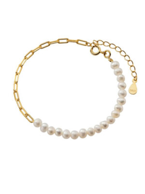 Bratara Pearl Chain din perle naturale albe de 4 mm si accesorii din argint 925 placate cu aur, lungime ajustabila