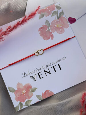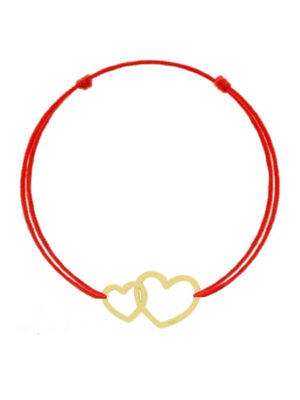 Bratara cu snur rosu si pandantiv din argint 925 in forma de inimi decupate aurii