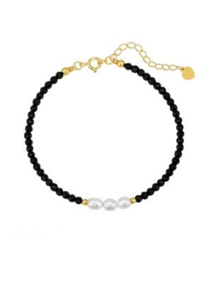 Bratara Triple Pearl din Spinel negru de 2,5 mm cu perle naturale de cultura albe de 5 mm, masura ajustabila