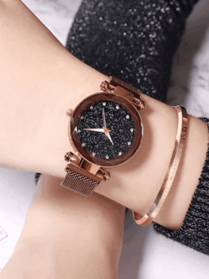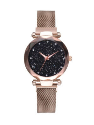 Ceas Shinny cu bratara magnetica aurie si cadran cu sclipici negru
