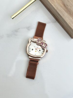Ceas de copii Hello Kitty cu bratara magnetica maro si cadran in forma de pisica, lungime ajustabila