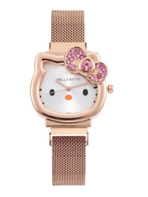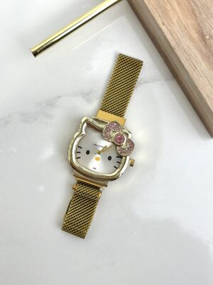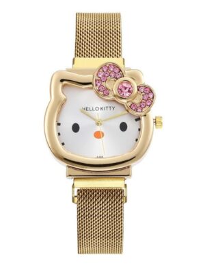 Ceas de copii Hello Kitty cu bratara magnetica aurie si cadran in forma de pisica, lungime ajustabila