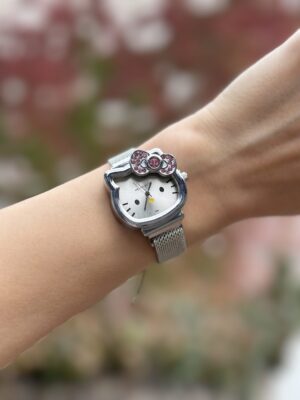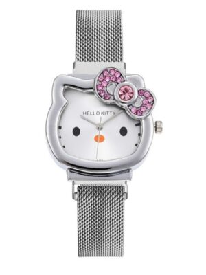 Ceas de copii Hello Kitty cu bratara magnetica argintiu si cadran in forma de pisica, lungime ajustabila