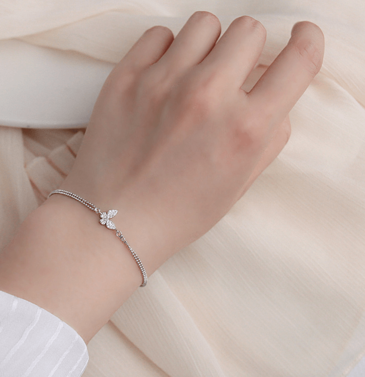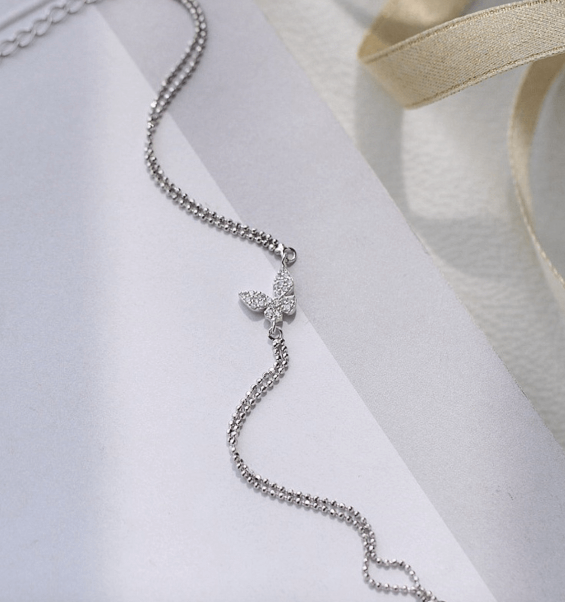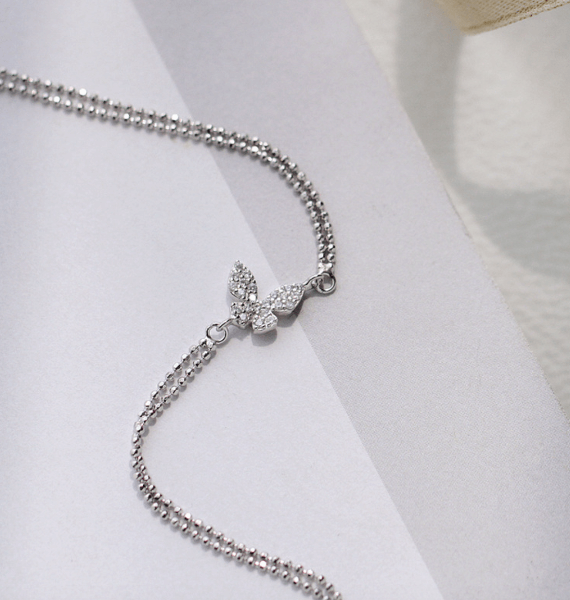Bratara din argint placata cu rodiu pentru stralucire cu pandantiv in forma de fluturas. Foarte usor de potrivit indiferent de circumferinta ingheieturii datorita faptului ca are o prelungire de 3 cm.