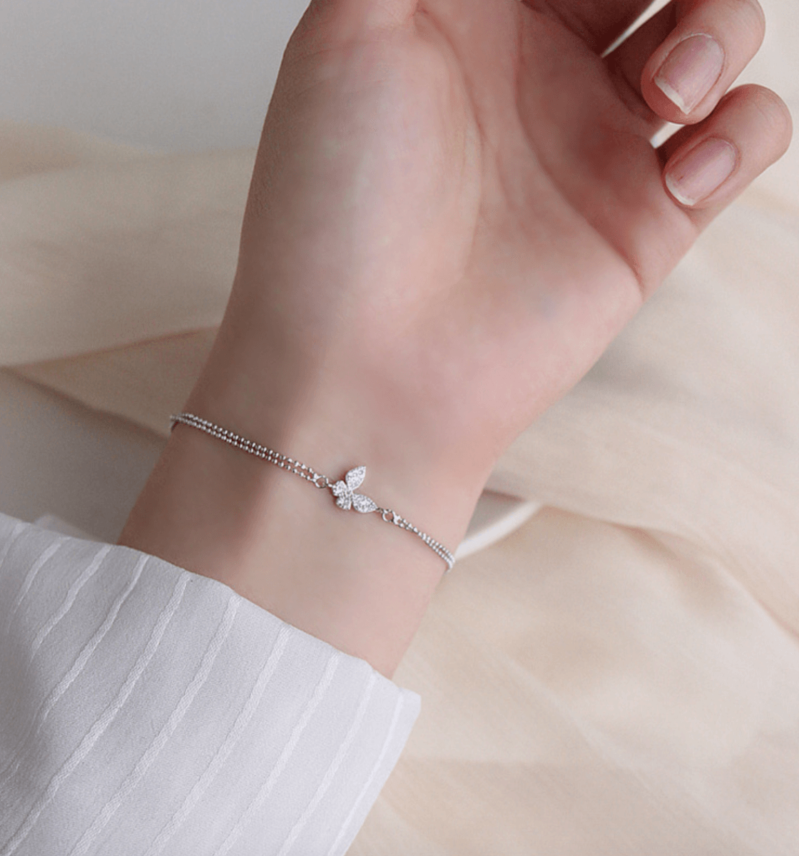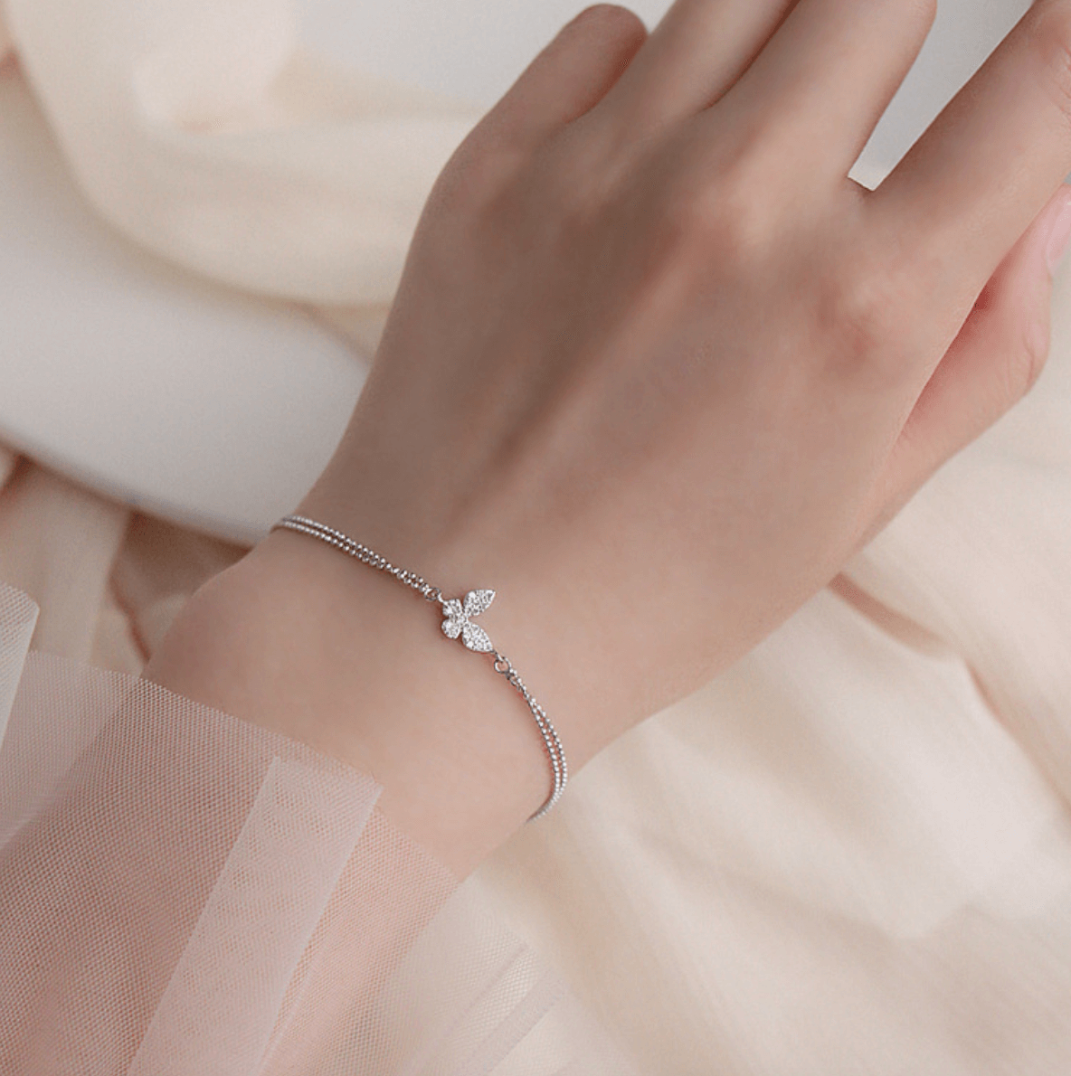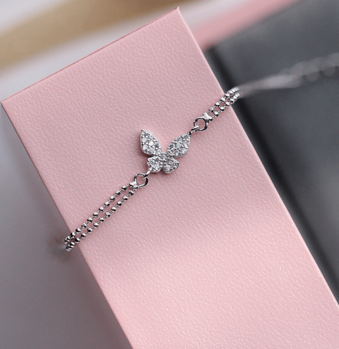 Bratara din argint placata cu rodiu pentru stralucire cu pandantiv in forma de fluturas. Foarte usor de potrivit indiferent de circumferinta ingheieturii datorita faptului ca are o prelungire de 3 cm.