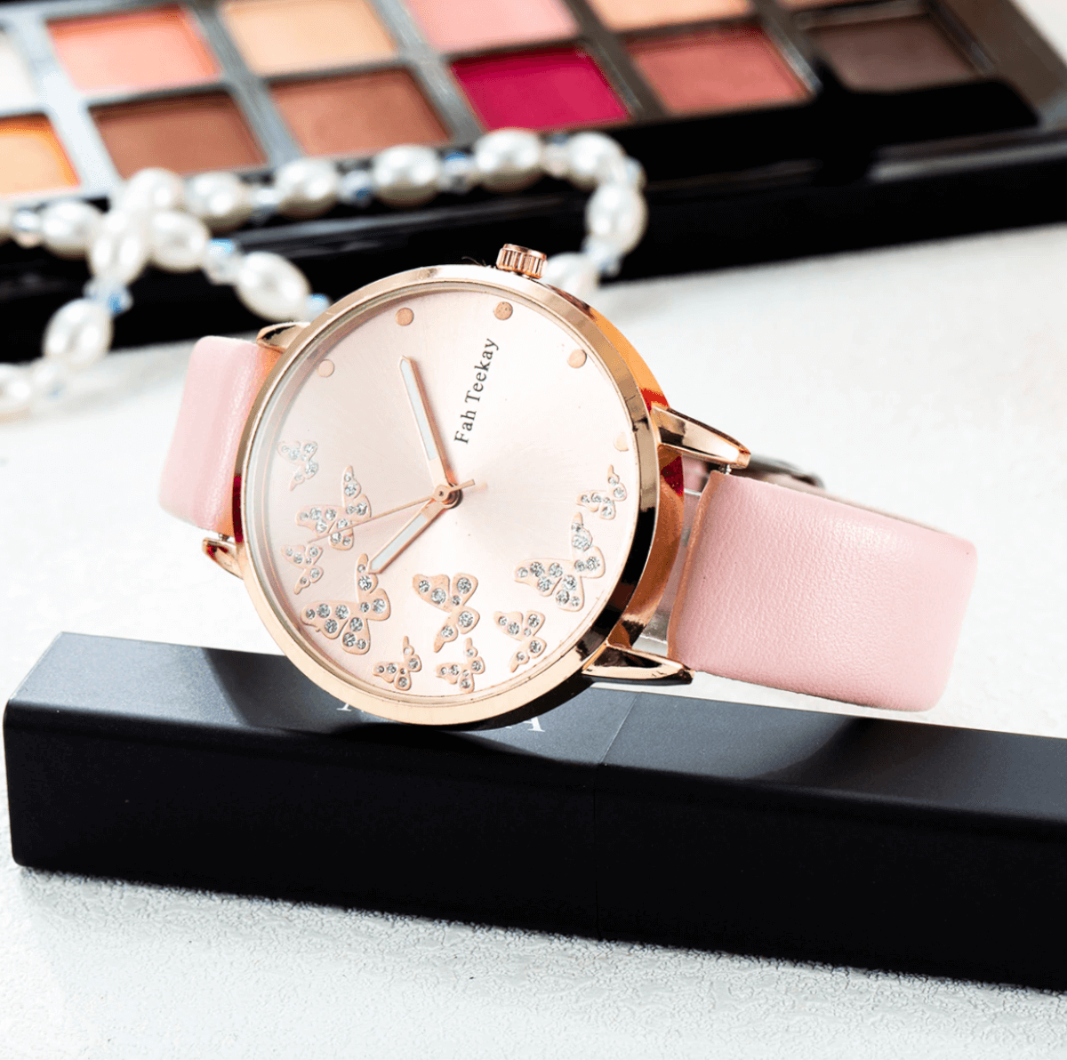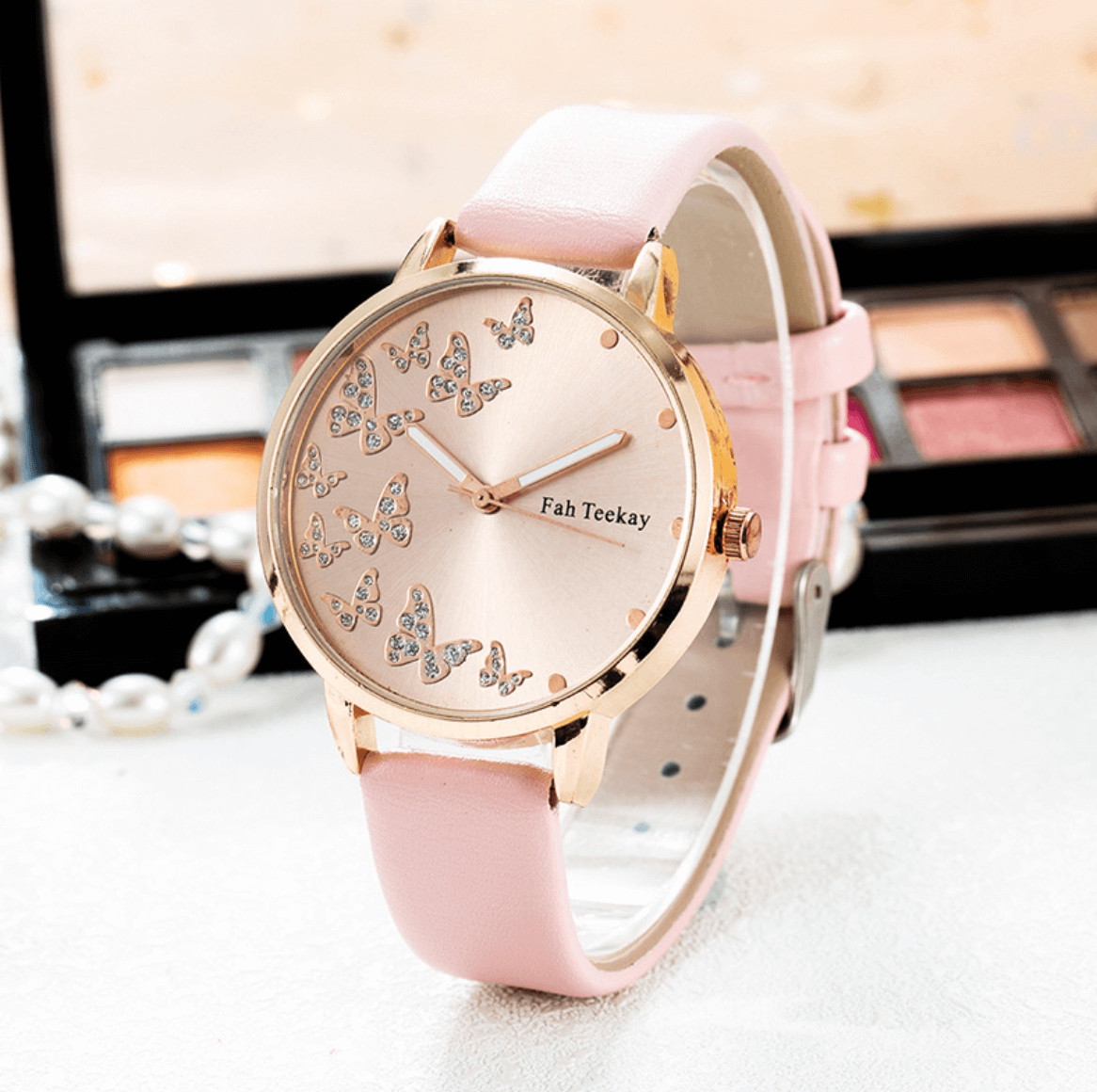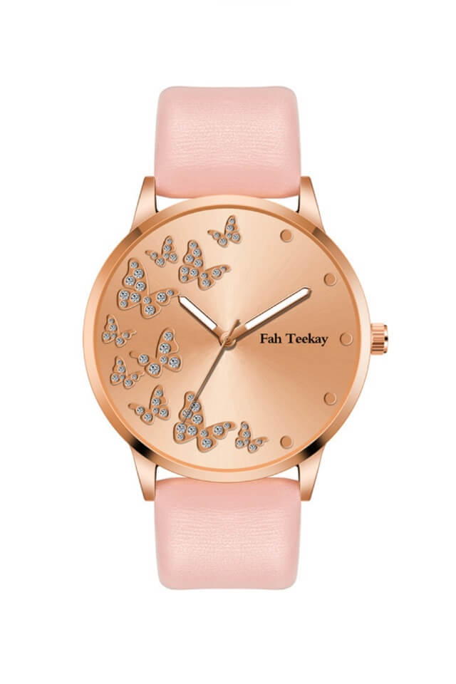 Ceas Shinny Butterfly cu bratara roz din piele ecologica si cadran cu fluturi